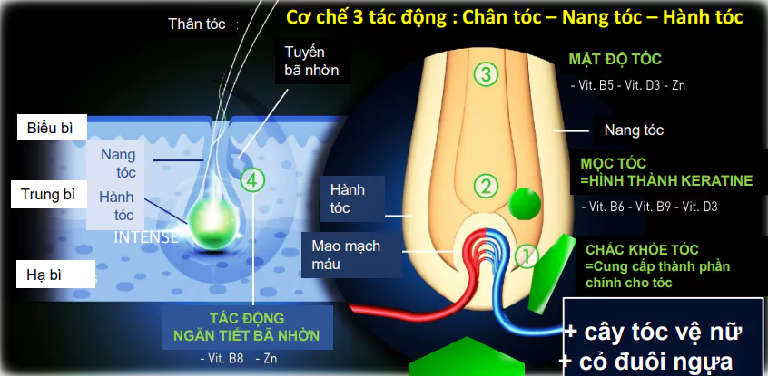 - Vitamin B8 (Biotin): Với tác dụng chống tiết bã nhờn, đem lại da đầu và mái tóc khoẻ mạnh, chắc khoẻ, giảm thiểu sự gãy rụng.