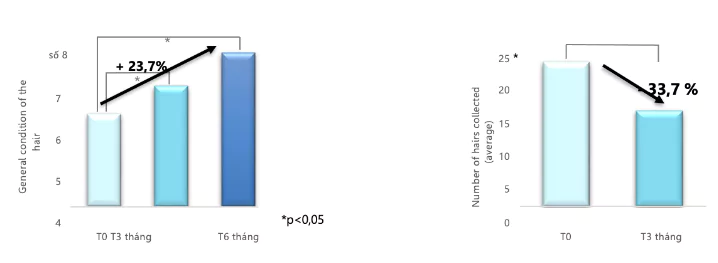 - Sau 3 tháng, số lượng tóc rụng thu được (theo phương thức chải 5 lần đều đặn và đếm sợi) giảm 33,7%.