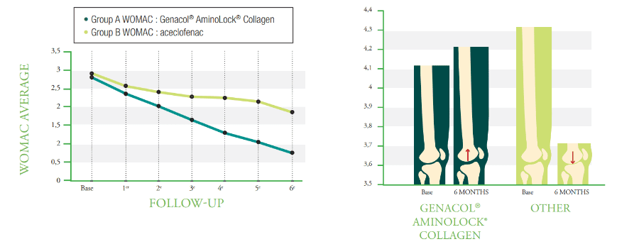 • Sau sáu tháng điều trị, chứng đau khớp và chức năng đã được cải thiện đáng kể khi sử dụng Genacol® AminoLock® Collagen so với thuốc NSAID tham chiếu.