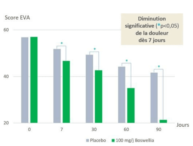 Thành phần chính của Viên uống bổ xương khớp Arkopharma Chondro-Aid 100% Articulation là Nhũ hương. Trong y học dân gian, chiết xuất từ nhựa gôm nhũ hương đã được sử dụng để điều trị các bệnh viêm mạn tính qua nhiều thế kỷ. Dược liệu này đã được chứng minh trên lâm sàng về hiệu quả giảm đau mạn tính thông qua phương pháp đối chứng giả dược trên 70 người, sử dụng 100mg chiết xuất nhũ hương mỗi ngày (tương đương với 30mg AKBA*), liên tục trong 90 ngày. Kết quả cho thấy cơn đau đã giảm đáng kể từ ngày thứ 7 và gần như biến mất tại thời điểm 3 tháng sau đó.