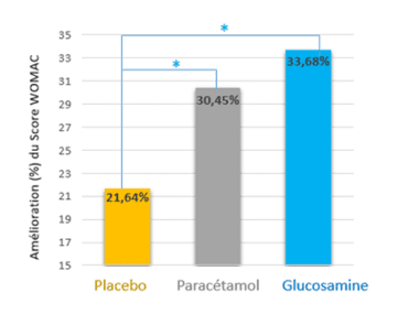 Bên cạnh đó, Glucosamin – một hoạt chất được nhiều người tiêu dùng biết đến với khả năng hỗ trợ ngăn ngừa thoái hóa khớp, đã được tiến hành nghiên cứu so sánh tác dụng cải thiện thoái hóa khớp bằng thang điểm Womac. Chỉ sau 6 tháng sử dụng Glucosamin, độ cải thiện tình trạng thoái hóa khớp tăng 33.68%, trong việc sử dụng paracetamol chỉ cải thiện 30.45%. Ngoài ra, những bệnh nhân sử dụng paracetamol thời gian dài cũng gặp nhiều rủi ro hơn về sức khoẻ.