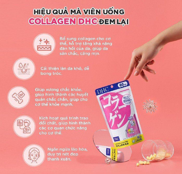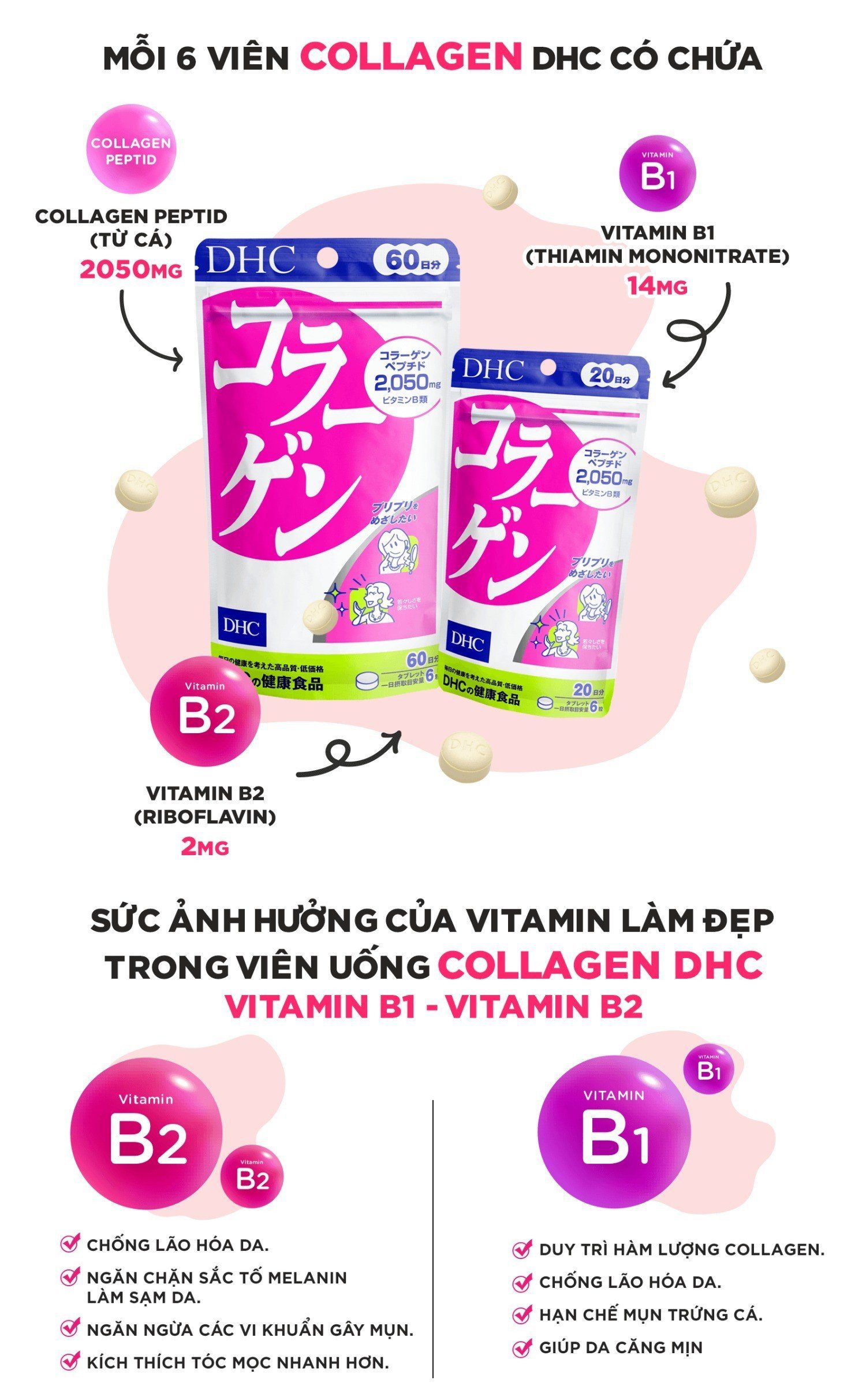 Ngoài ra, viên uống Collagen DHC còn có nhiều ưu điểm khác như: - Kết hợp 3 thành phần Collagen + Vitamin B1 + Vitamin B2 giúp tối ưu tác dụng hỗ trợ làm đẹp da, khỏe da từ sâu bên trong.