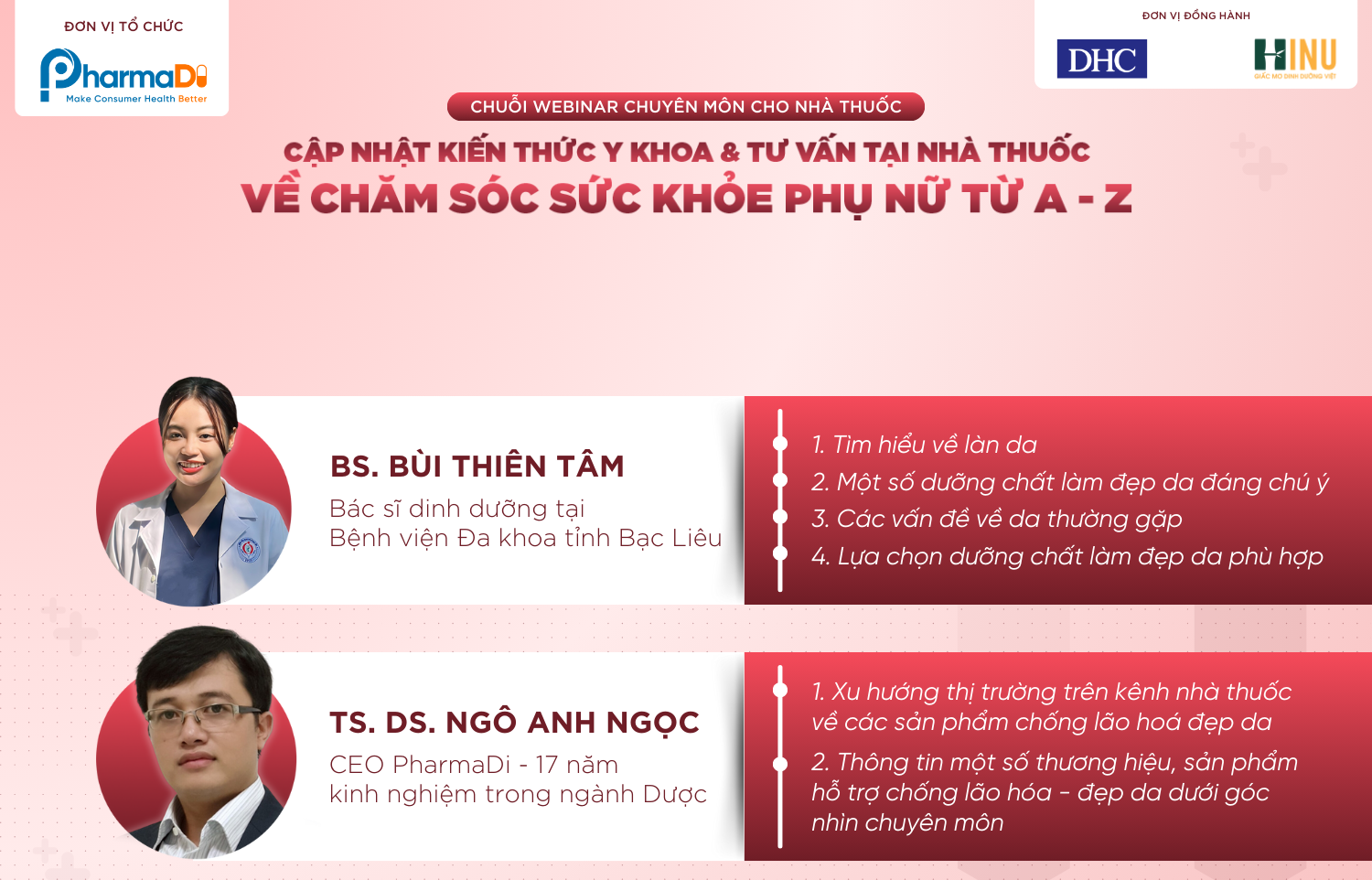 Đến với buổi Webinar về chủ đề “Chống lão hoá, đẹp da”. PharmaDi rất hân hạnh được đồng hành cùng BS. Bùi Thiên Tâm và Tiến sĩ DS. Ngô Anh Ngọc để chia sẽ đến Quý Anh/Chị nhiều thông tin y khoa bổ ích và trao tặng những phần quả, chương trình nhập sỉ độc quyền chỉ có trong buổi hội thảo.